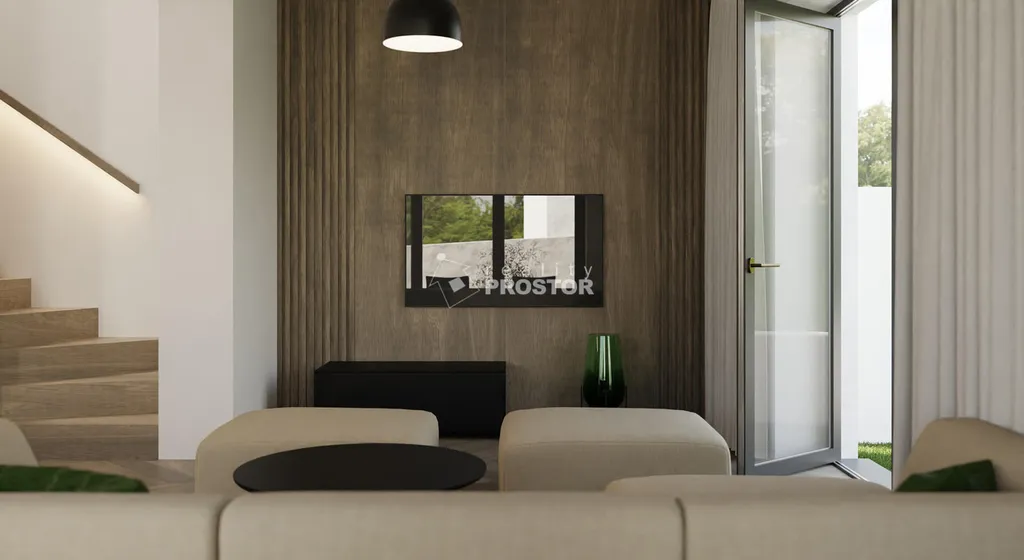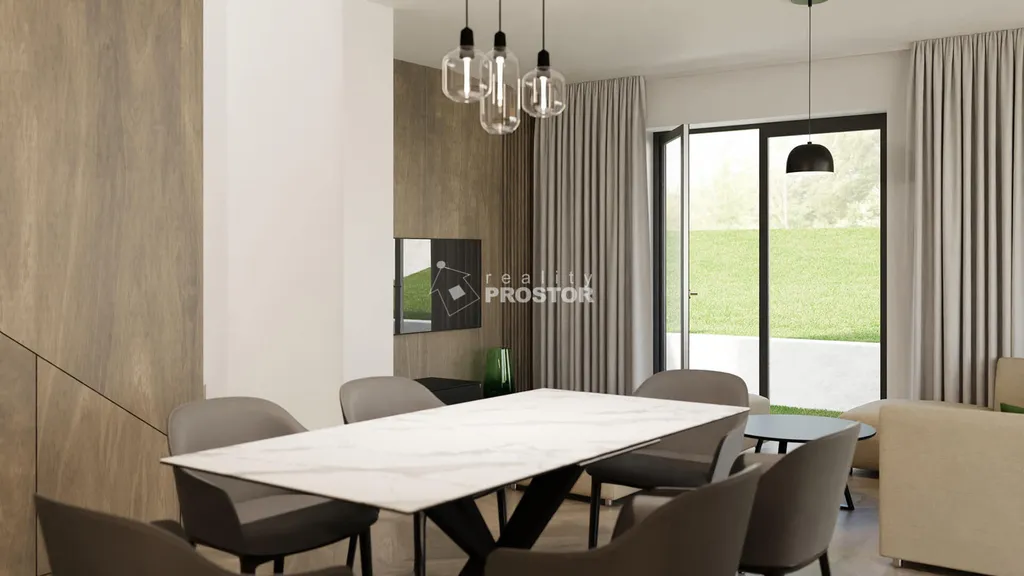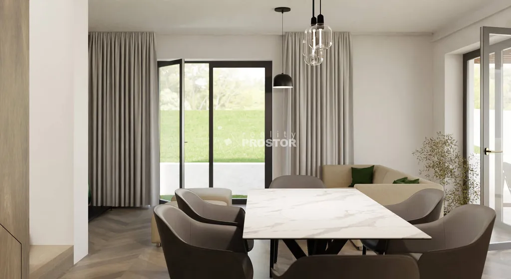 V přízemí domu je prostorný obývací pokoj s kuchyňským koutem, jenž díky velkým francouzským oknům nabízí dostatek přirozeného světla a přímý vstup na zahradu s terasou orientovanou na jihovýchod. Dále je zde pokoj vhodný jako ložnice, pracovna nebo pokoj pro hosty, samostatné WC a praktická technická místnost vybavená tepelným čerpadlem (vzduch–voda), výlevkou a přípravou pro pračku i sušičku. V patře se nacházejí tři prostorné ložnice a komfortní koupelna s vanou a toaletou.