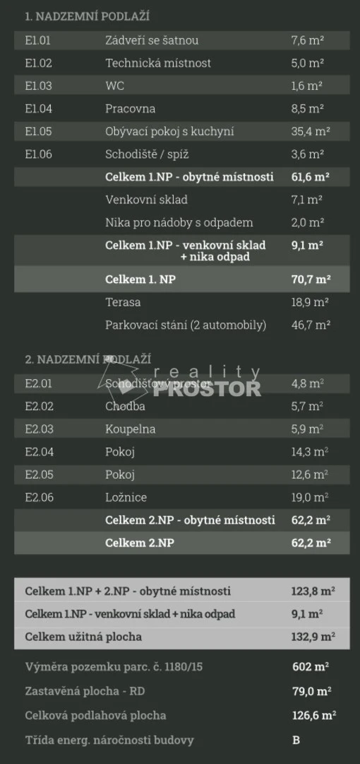 Dům je vytápěn úsporným tepelným čerpadlem napojeným na podlahové vytápění, je vybaven rekuperací s řízeným větráním a kvalitními šestikomorovými okny s trojskly. Energetická třída B zajišťuje nízké provozní náklady. Nemovitost je připravena na instalaci moderních úsporných technologií, jako jsou fotovoltaické panely, závlahový systém nebo multimediální rozvody. Stavba je provedena s důrazem na detail, funkčnost a dlouhou životnost s použitím kvalitních materiálů od renomovaných dodavatelů.