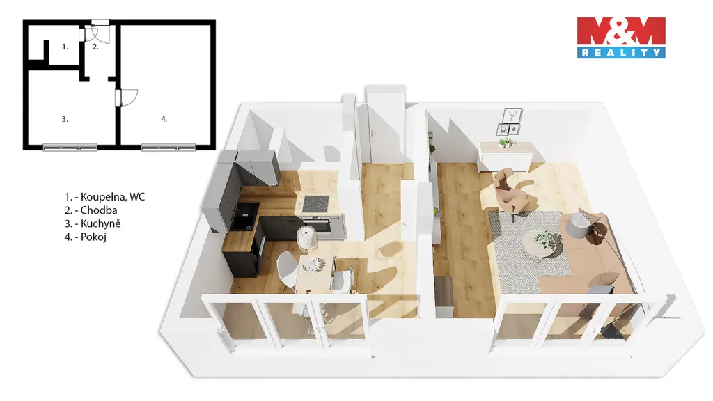 Byt se nachází ve třetím nadzemním podlaží osmipodlažního zatepleného panelového domu s výtahem. Dispozice bytu zahrnuje ložnici, oddělenou kuchyni s jídelnou a koupelnu s toaletou. K bytu náleží sklepní kóje, která poskytuje další úložné prostory.