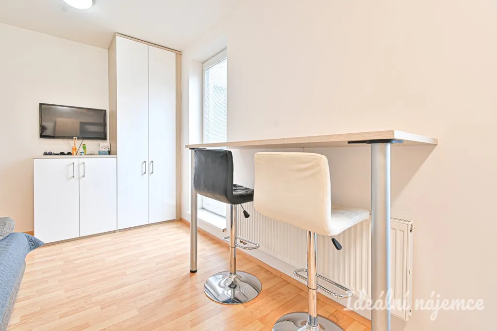 V obytné části se nachází pohovka, pracovní stůl se židlí, barový stůl s židlemi, komody a televize. Koupelna je nová a moderně řešená, se sprchovým koutem, umyvadlem a toaletou.