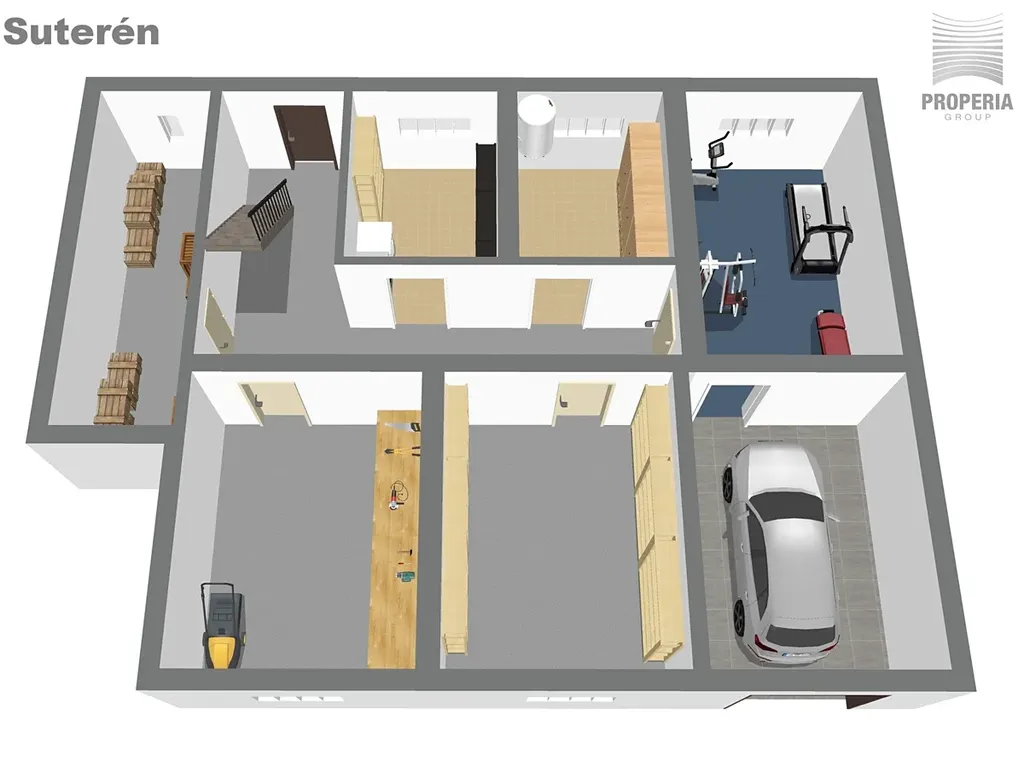 Suterén o celkové ploše 90,71 m² zahrnuje garáž, sklep a dalších pět užitných místností.