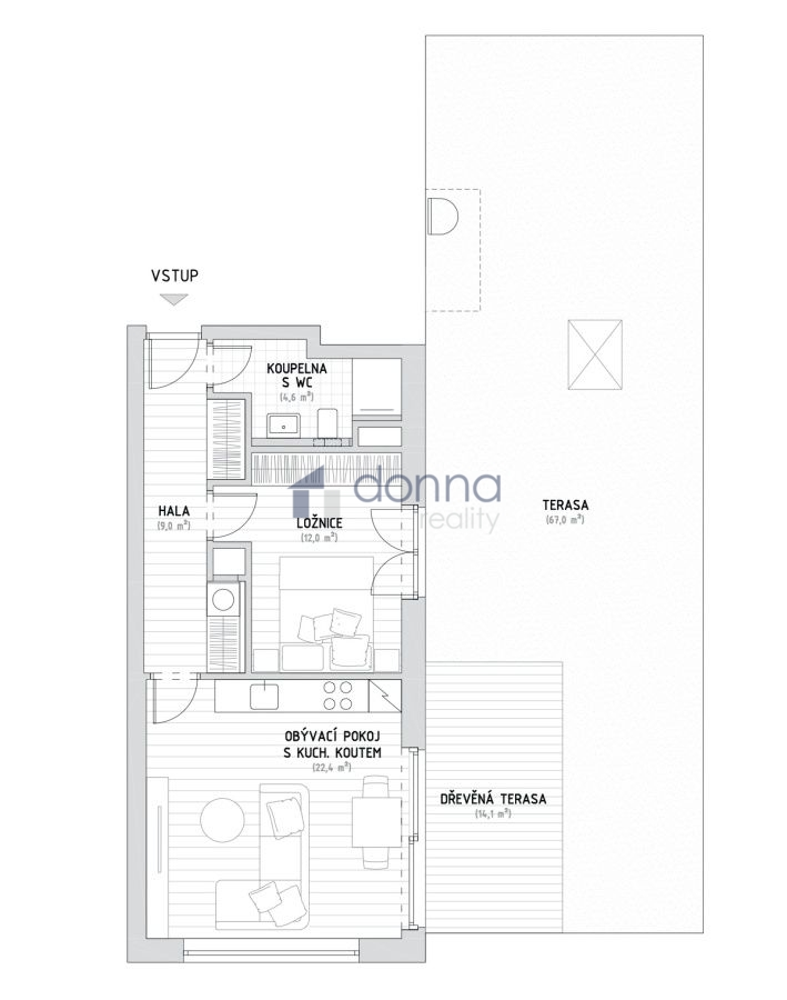 Nabízíme k prodeji moderní byt 2+kk, plocha 51,3 m2 + terasa 81m2, situovaný ve 3. patře bytového domu s výtahem v komplexu Bleriot z roku 2020, Prahy 9 - Kbely, ulice Plzákova.