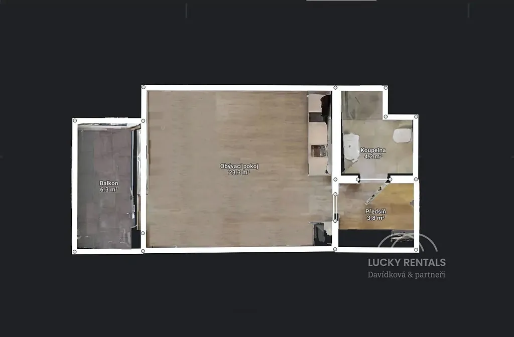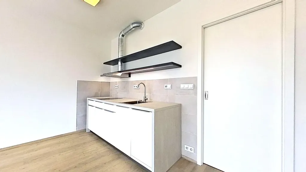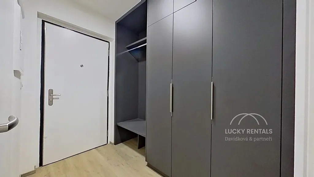 Do bytu se vstupuje bezpečnostními vchodovými dveřmi, v předsíni je umístěna prostorná vestavná šatní skříň na míru. Součástí prostorného pokoje je kuchyňský kout s kuchyňskou linkou plně vybavenou vestavnými spotřebiči – indukční varní deskou, digestoří s venkovním odtahem, myčkou, lednicí a kombinovanou pečicí/mikrovlnnou troubou. Z hlavního pokoje je vstup na balkón s příjemným výhledem do okolí.