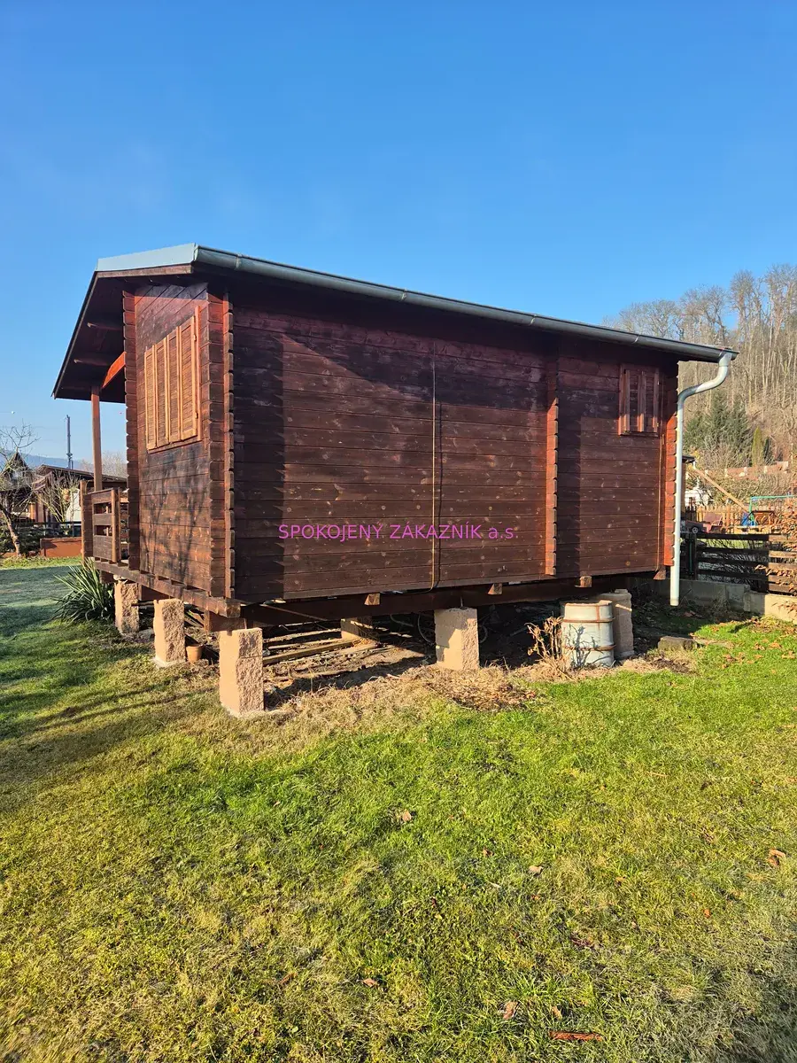 Chatka cca 5 let stará je umístěná na patkách a tvoří ji terasa, kuchyň, ložnice a menší místnost. Menší místnost je v současnosti využívaná jako komora, jinak lze využít i na případnou koupelnu. Vedle domu je dílna na nářadí a suché WC.