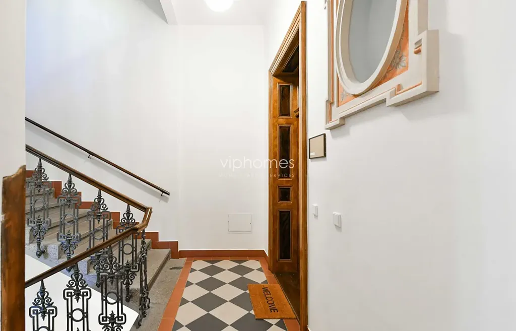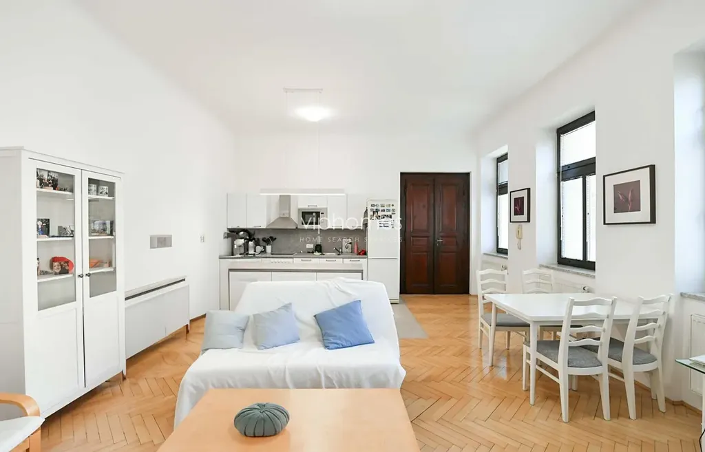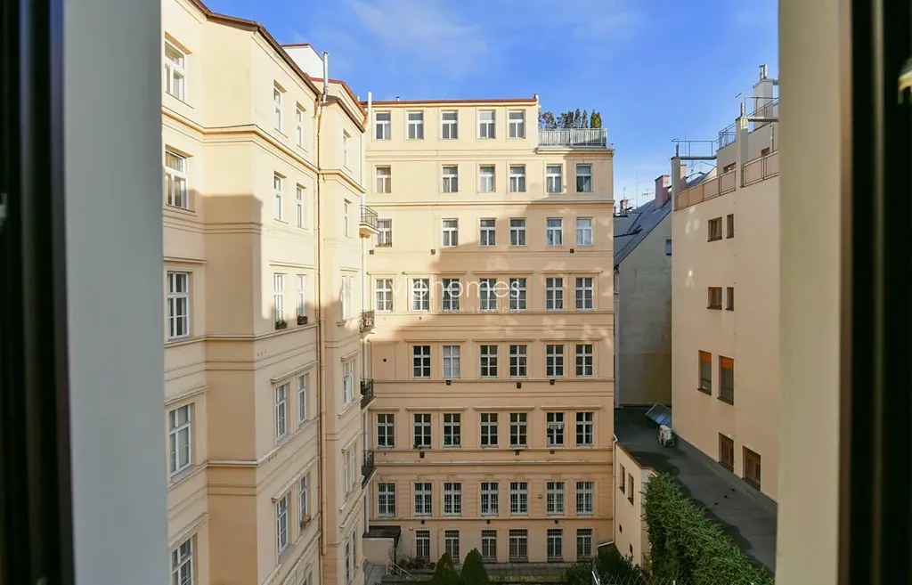 Interiér bytu sestává: vstupní hala s vestavěnou skříní, plně vybavená kuchyň, velký pokoj (vysoké stropy a štuky),další místnost s vlastní koupelnou ( sprchový kout a WC), dále extra toaleta. Nemovitost je charakteristická množstvím originálních historických prvků - vysoké stropy, dřevěné parketové podlahy, štuky. Vybavení prostoru: pračka, sušička, kabelová TV, satelitní příjem, PC síť, domácí vrátný. Možnost parkování za 2.700 Kč/měsíc plus DPH. Služby a úhrada vody 1870/měsíc. Úhrada za spotřebu energií. Voda dle skutečné spotřeby vyúčtovatelná.