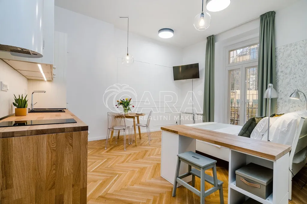 Krásná a útulná garsonka v cihlovém domě v centru Holešovic nabízí veškeré pohodlí pro život