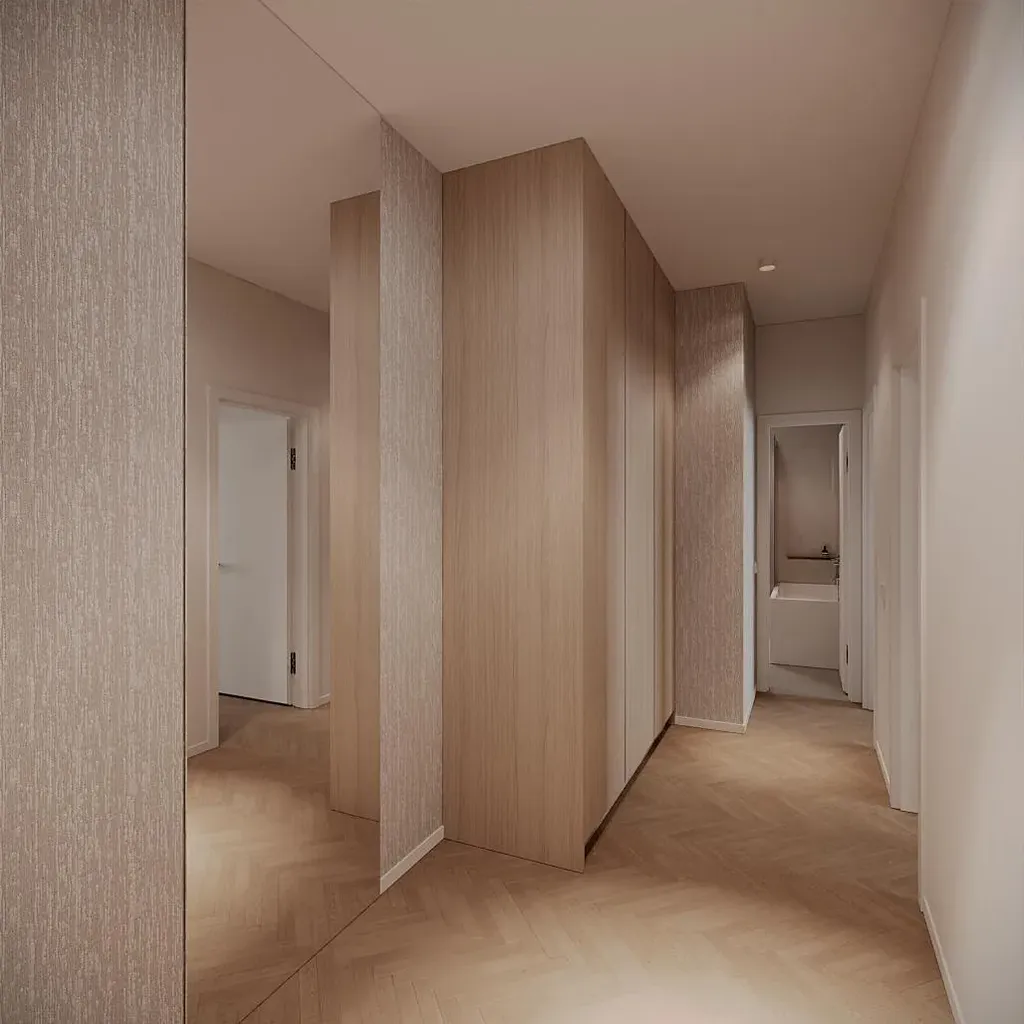 Dispozice bytu je promyšlená s ohledem na komfortní každodenní fungování. Vstupní chodba ústí do vzdušného obývacího pokoje s kuchyňskou linkou a jídelní zónou. Kuchyně je řešená podél stěny, poskytuje dostatek pracovního prostoru a plynule navazuje na obývací část. Z obývacího pokoje se vstupuje do ložnice orientované do klidné části domu. Pokoj nabízí dost místa pro manželskou postel i kvalitní úložné řešení.