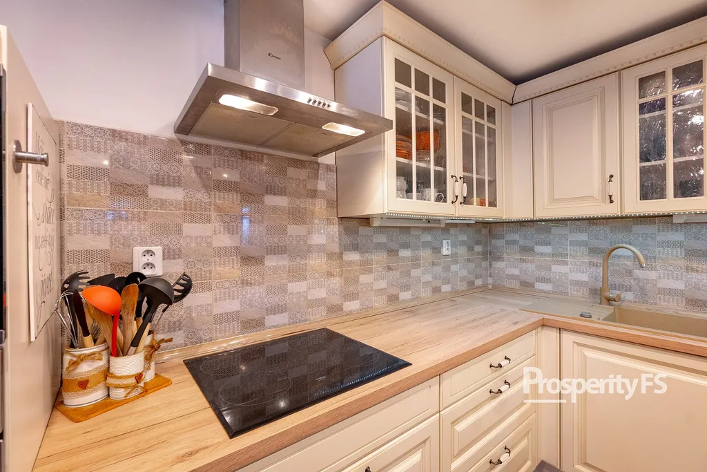 V domě zůstává kompletní vybavení – kuchyň, krb, gauč i spotřebiče.
