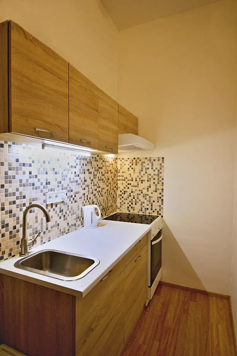 Kuchyňská linka je vybavená kuchyňskou linkou s troubou, sklokeramickou deskou, digestoří, lednicí a mikrovlnnou troubou.