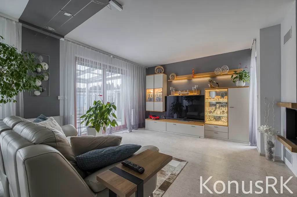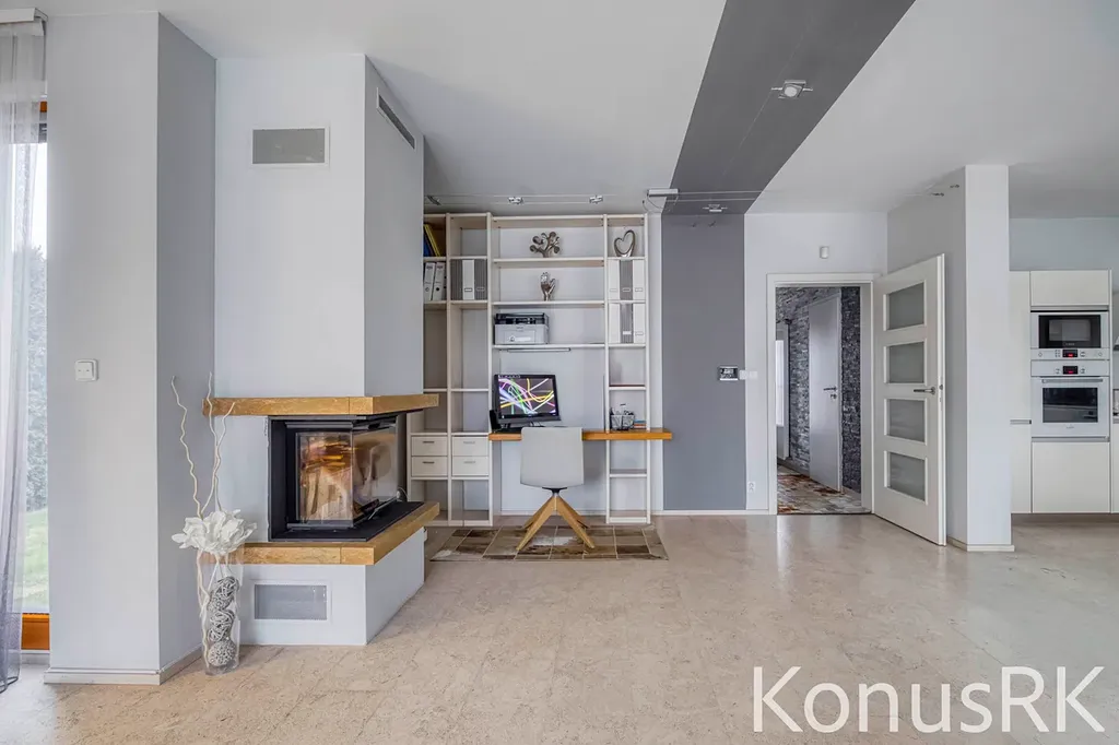 V přízemí domu se nachází světlý obývací prostor s přímým vstupem na zastřešenou terasu, ideální pro posezení v jakémkoli počasí. V srdci domu je plně funkční krb, který nejen navodí útulnou atmosféru, ale zároveň slouží jako efektivní doplňkový zdroj tepla.