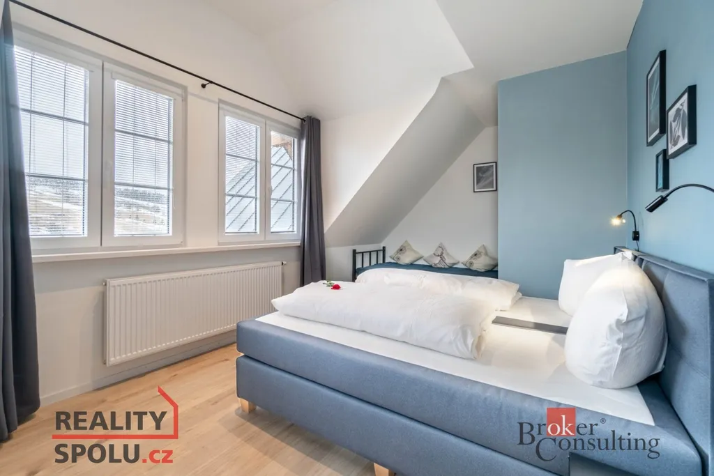 Kapacita tohoto apartmánu je až 7 osob. Dispozice je velmi praktická, lze oddělit na dvě samostatné jednotky s vlastním vchodem. Obě ložnice mají každá vlastní koupelnu, v obývacím pokoji je kompletně vybavená kuchyň včetně spotřebičů a nádobí, jídelní stůl s židlemi a rozkládací pohovka.