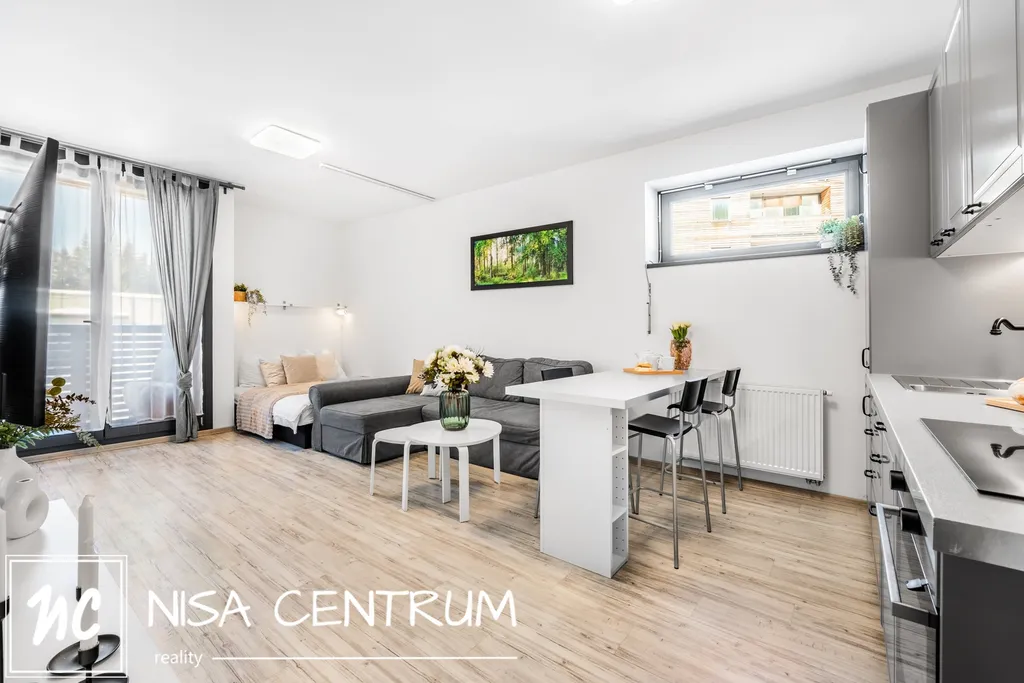 Dispozici plně vybaveného bytu tvoří vzdušný obývací pokoj s kuchyňským koutem a lodžií orientovanou na severozápad, ložnice, koupelna s prostorným sprchovým koutem a toaletou, vstupní chodba a technická místnost.