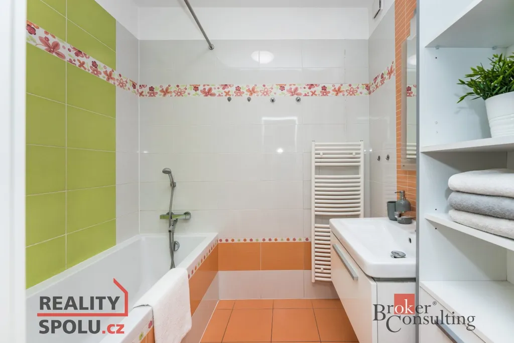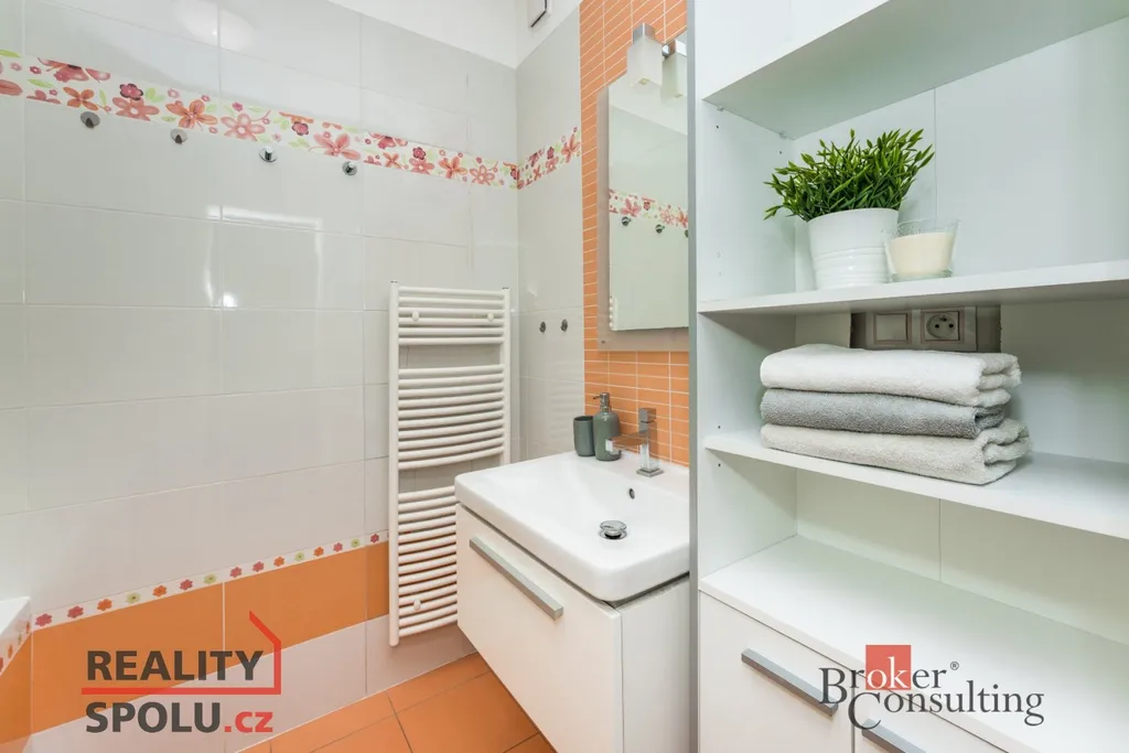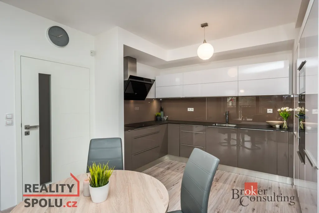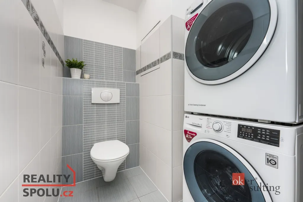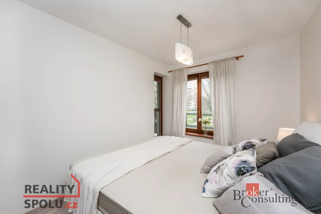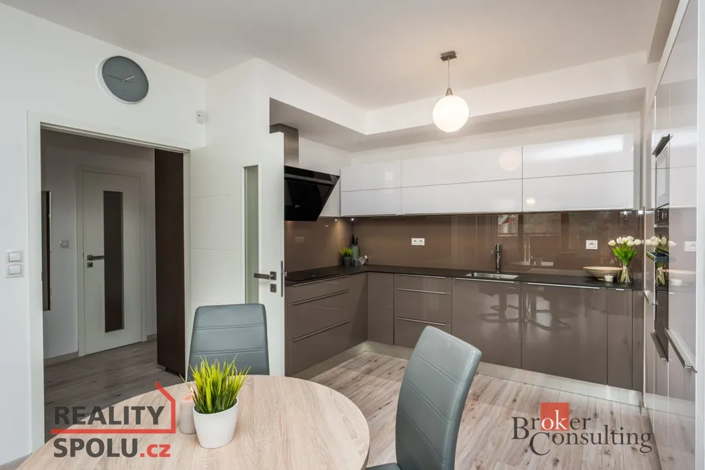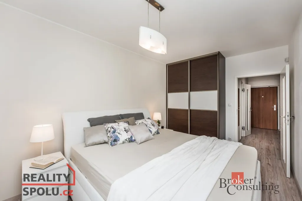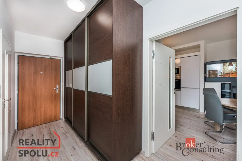 Kuchyňská linka značky Hanák je vybavena vestavěnou myčkou, horkovzdušnou troubou, mikrovlnnou troubou, lednicí, mrazákem, indukční deskou a digestoří. Obývací stěna, též značky Hanák, je součástí pronájmu společně s jídelním stolem, židlemi, šatními skříněmi a koupelnovou skříňkou. K bytu dále náleží sklep, prostorná lodžie se vstupem z obývacího pokoje i ložnice a společná zabezpečená kolárna.