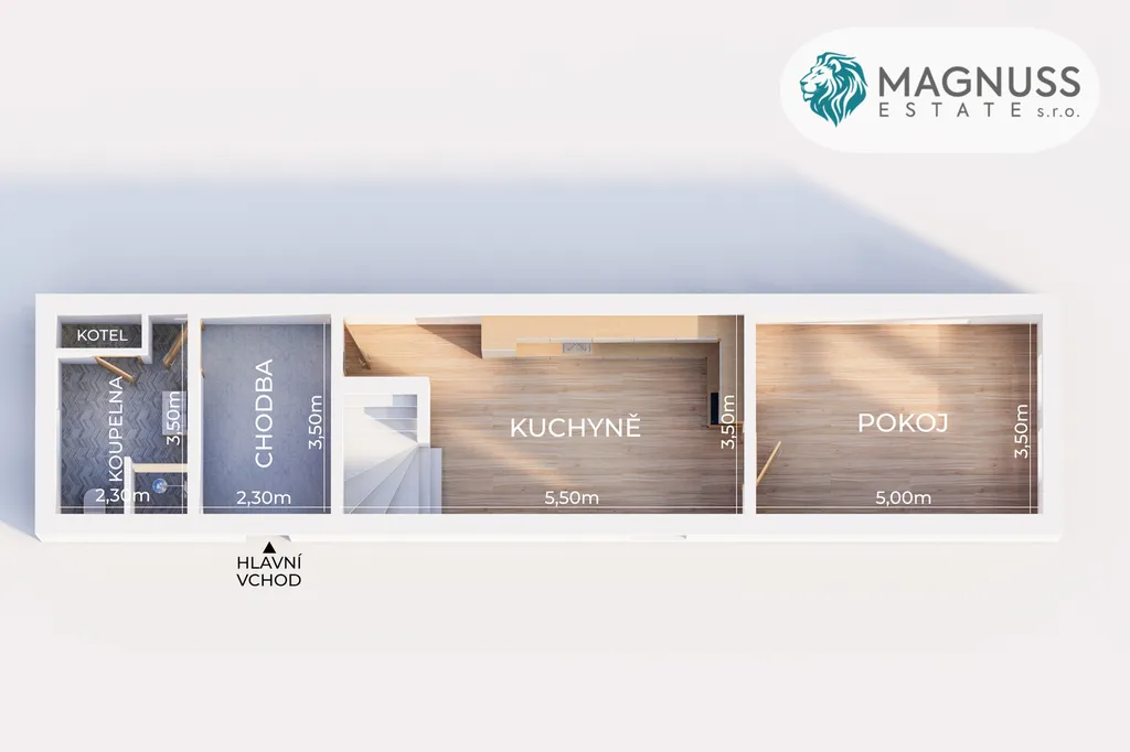 • 1. NP: vstupní chodba, koupelna se sprchovým koutem a WC, kuchyně a ložnice