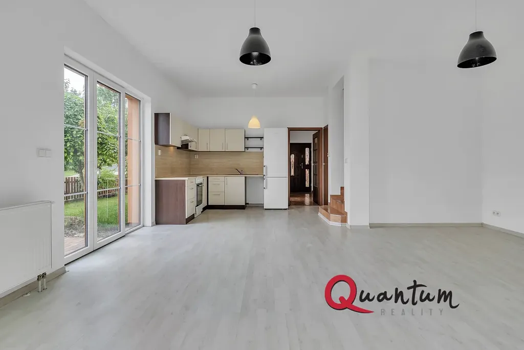 prostorný a prosvětlený obývací pokoj propojený s moderním kuchyňským koutem a přímým vstupem na soukromou zahradu (35 m²), která poskytuje příjemné místo pro relaxaci i rodinné chvíle