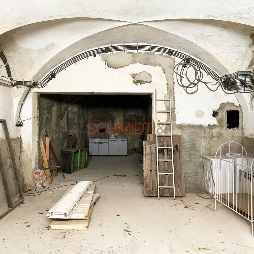 V případě zájmu je možné využít také navazující kvelbený vinný sklep. Jak je zjevné z fotografií, přízemí domu již prošlo částečnou rekonstrukcí. Podlahy jsou zhotoveny principem IGLU (proudění vzduchu podlahou vysušuje stavbu a úspěšně zamezuje jejímu vlhnutí a šíření plísní), je zde rozvedena voda a kanalizace s ohledem na to, aby byla možnost vybudování barového pultu, prodejny a zázemí s WC. Další fáze dokončení je na představách nového nájemce a bude zohledněna v nájemném.