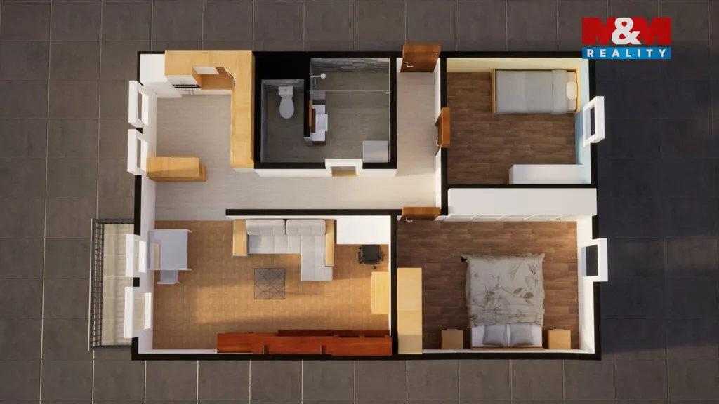 Samostatné neprůchozí pokoje. Prostorný obývací pokoj spojený s kuchyní, velká koupelna.