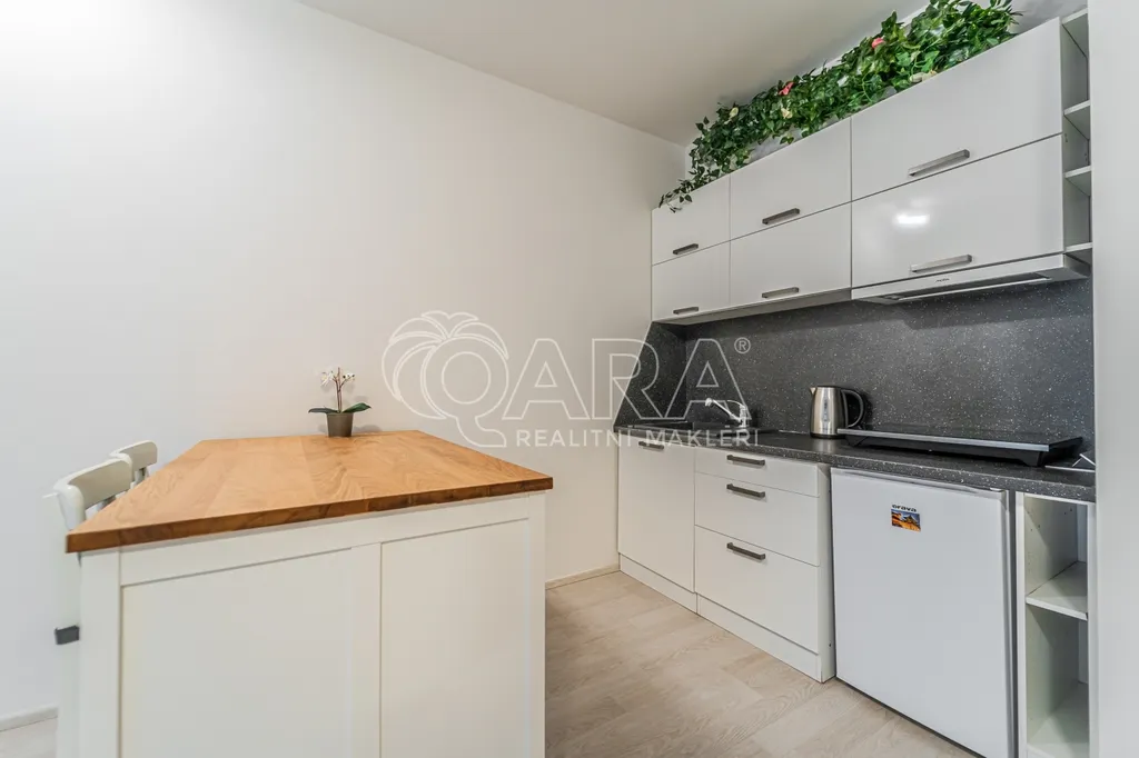 Hlavní obytný prostor o velikosti 27 m² je vybaven kuchyňskou linkou s moderními elektrospotřebiči (lednička, indukční vařič, digestoř).