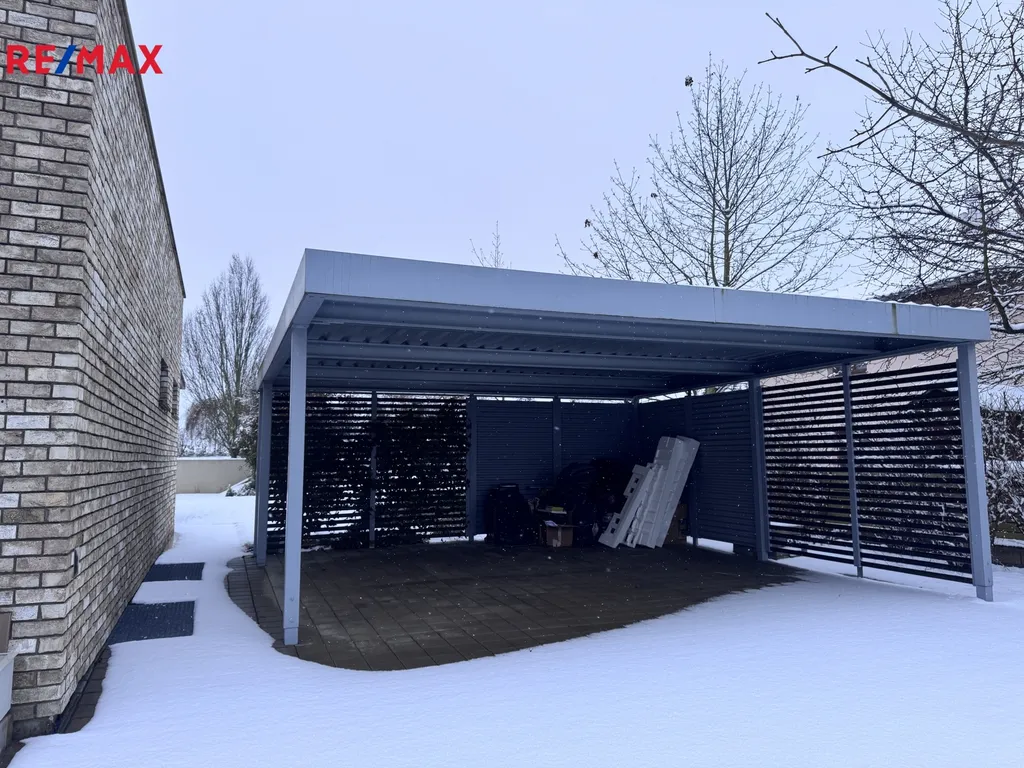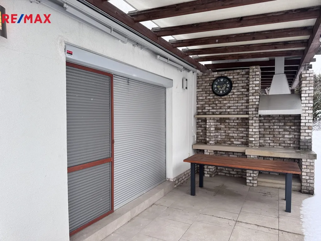 Na zahradě je venkovní krb , terasa s elektrickou markýzou , trampolína , bazén a přístřešek na parkování 2 aut.