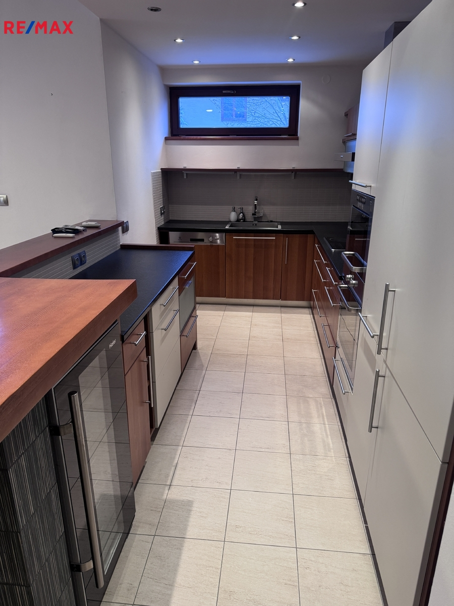 V suterénu se nachází odpočinková místnost se saunou , koupelnou a technickým zázemím o podlahové ploše 40 m2.