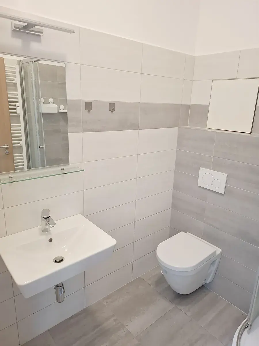 Koupelna je zařízena skleněným rohovým sprchovým koutem, toaletou a umyvadlem se zrcadlovou poličkou.