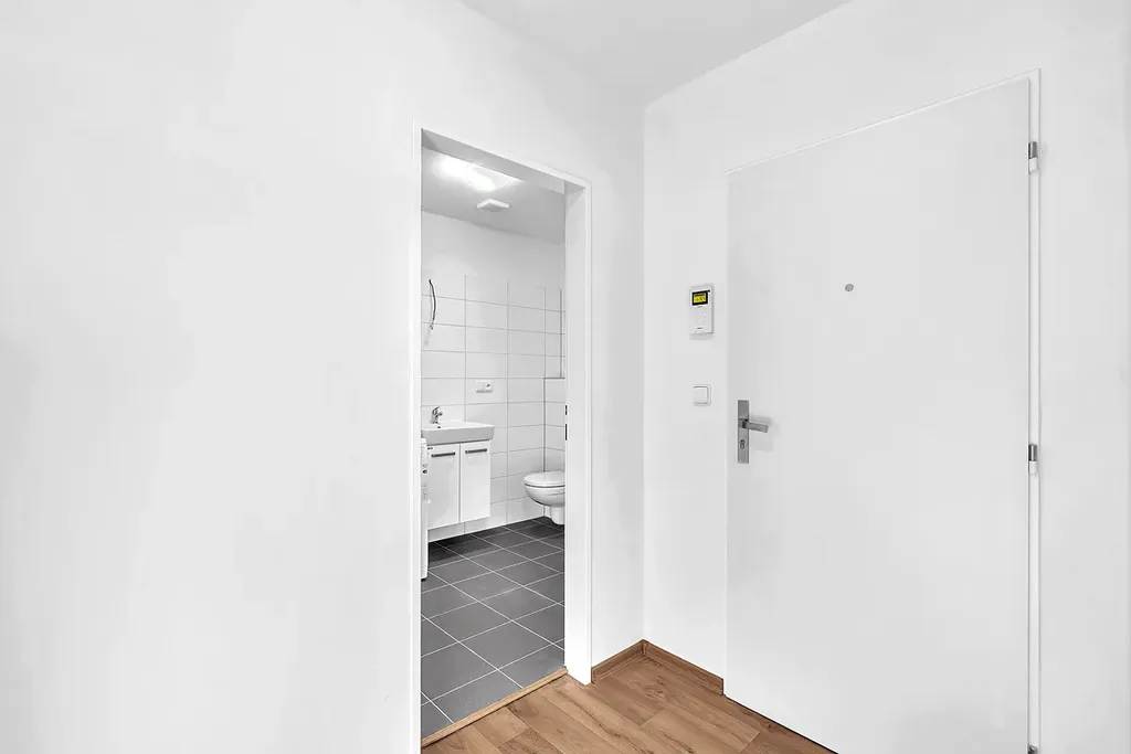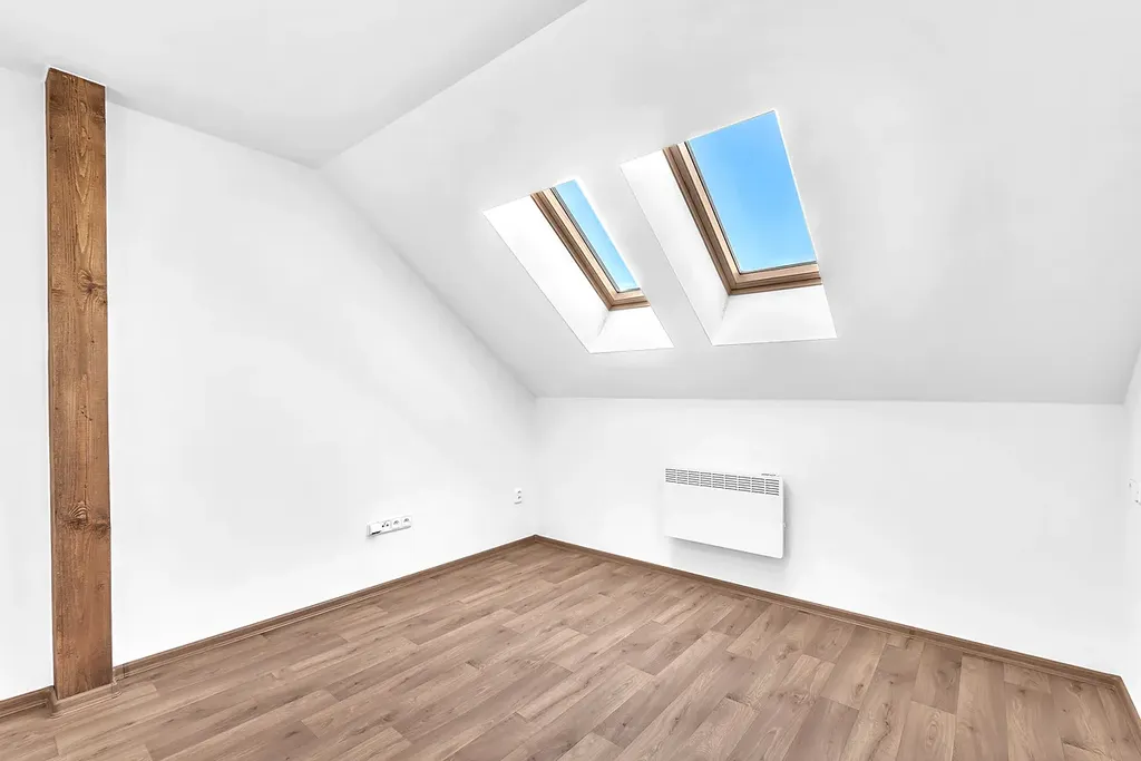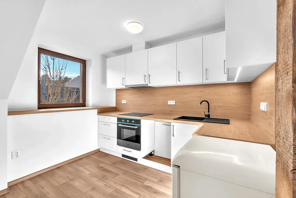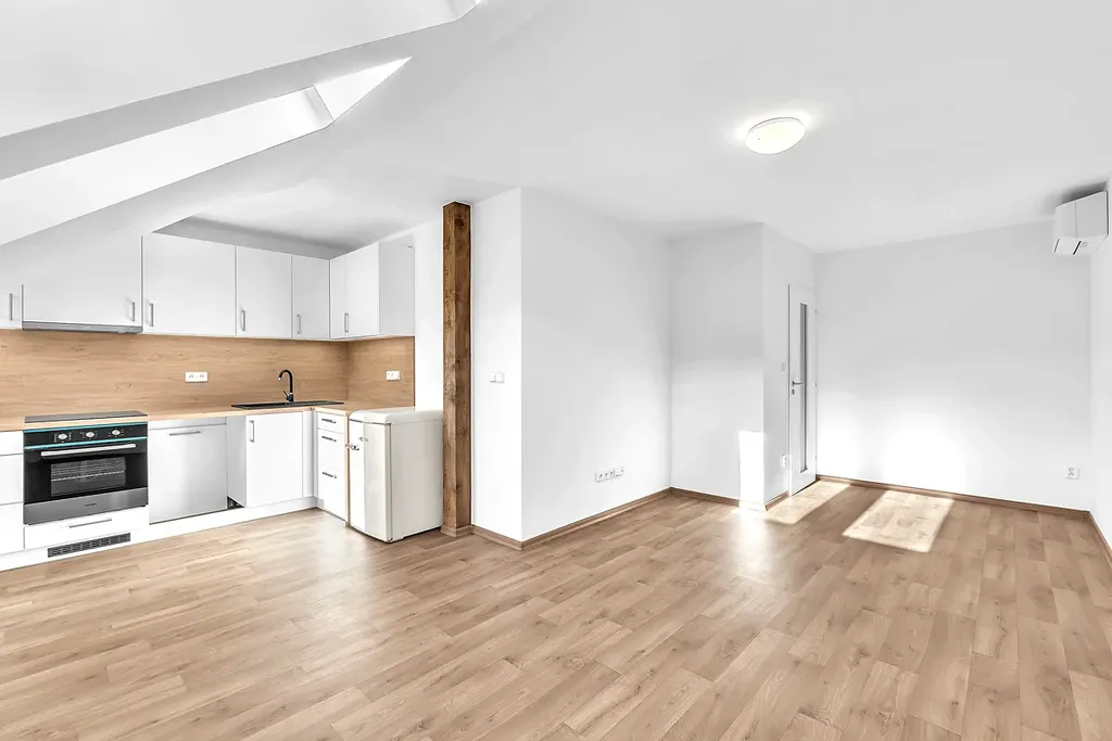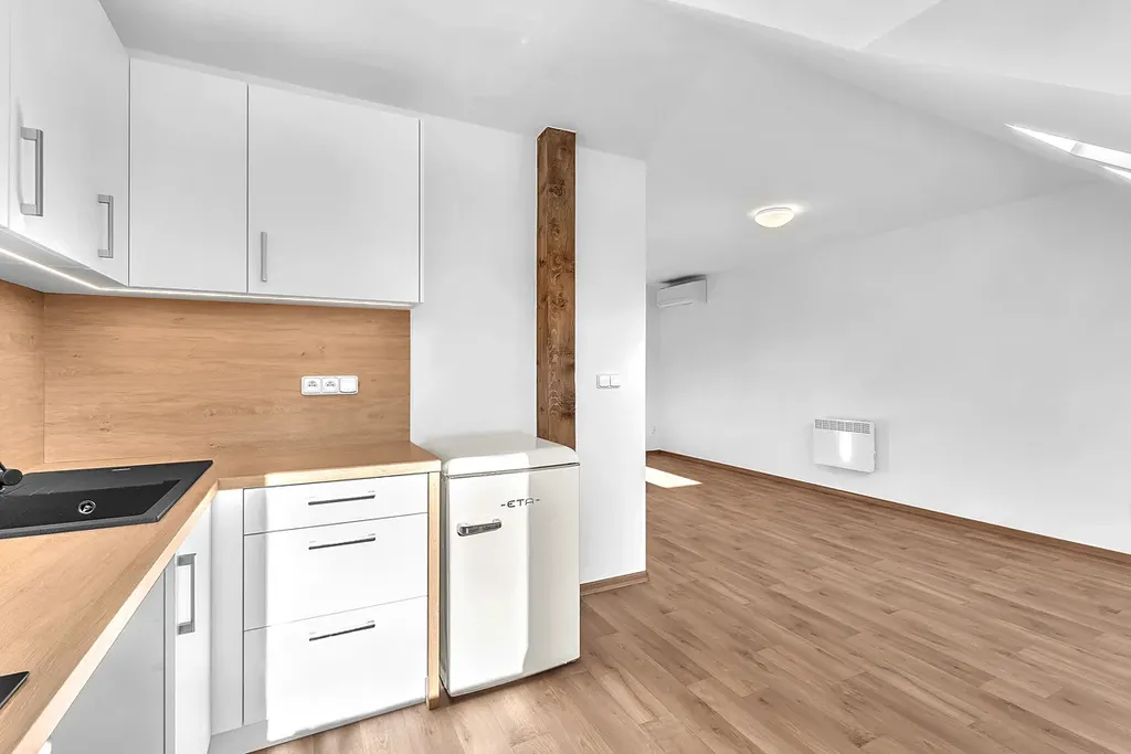 Byt disponuje otevřeným obývacím prostorem s kuchyňským koutem vybaveným moderní kuchyňskou linkou a spotřebiči. Díky podkrovnímu uspořádání a odhalenému trámu je byt osobitý a zalitý přirozeným světlem.