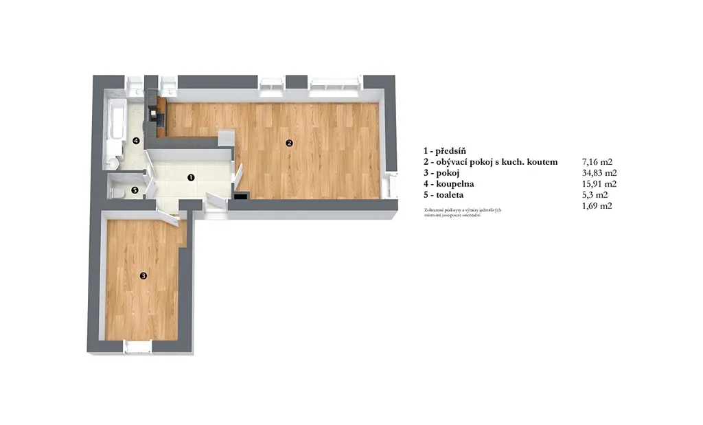 Koupelna se sprchovým koutem: 2,89 m2 a samostatné WC 1,72 m2