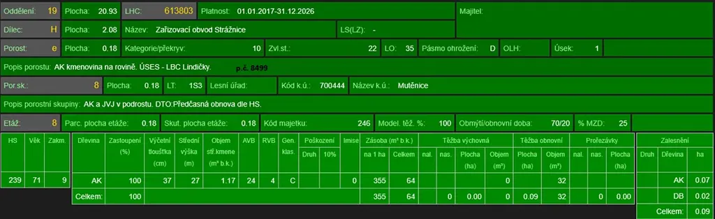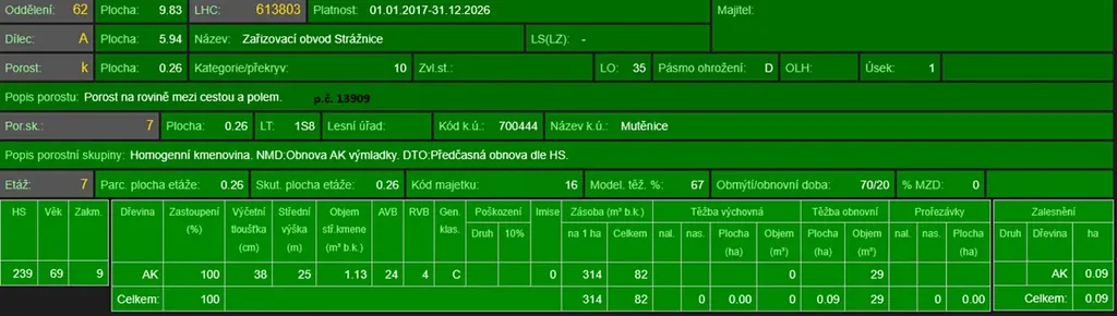 - p.č. 13909 vedená jako lesní pozemek o celkové výměře 3 701 m2 (stáří lesa 78 let - zastoupení dřevin akát).
