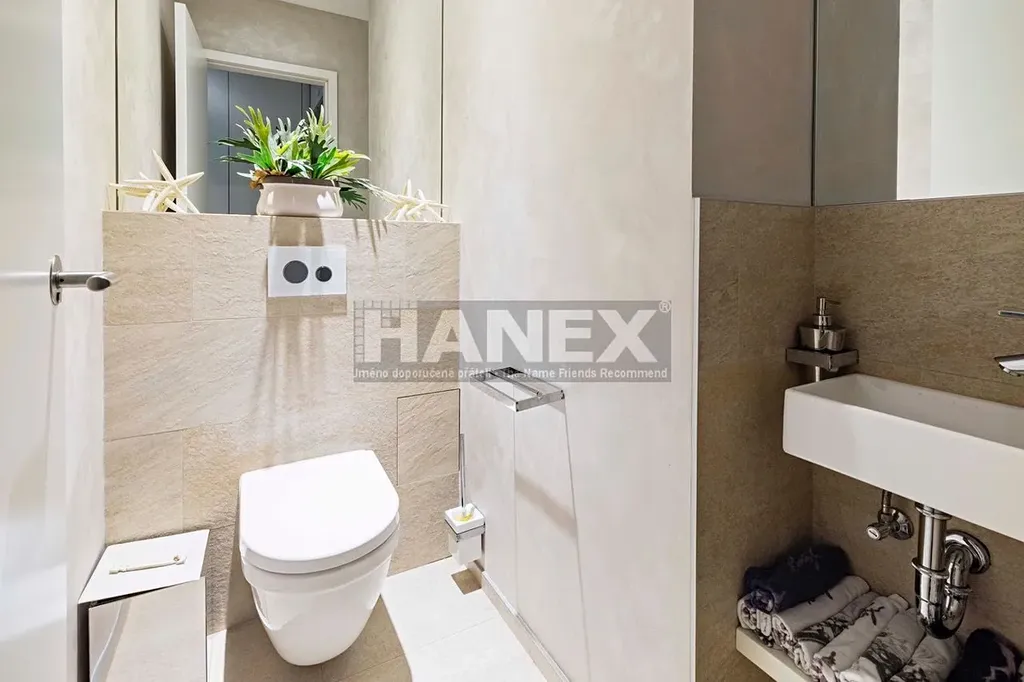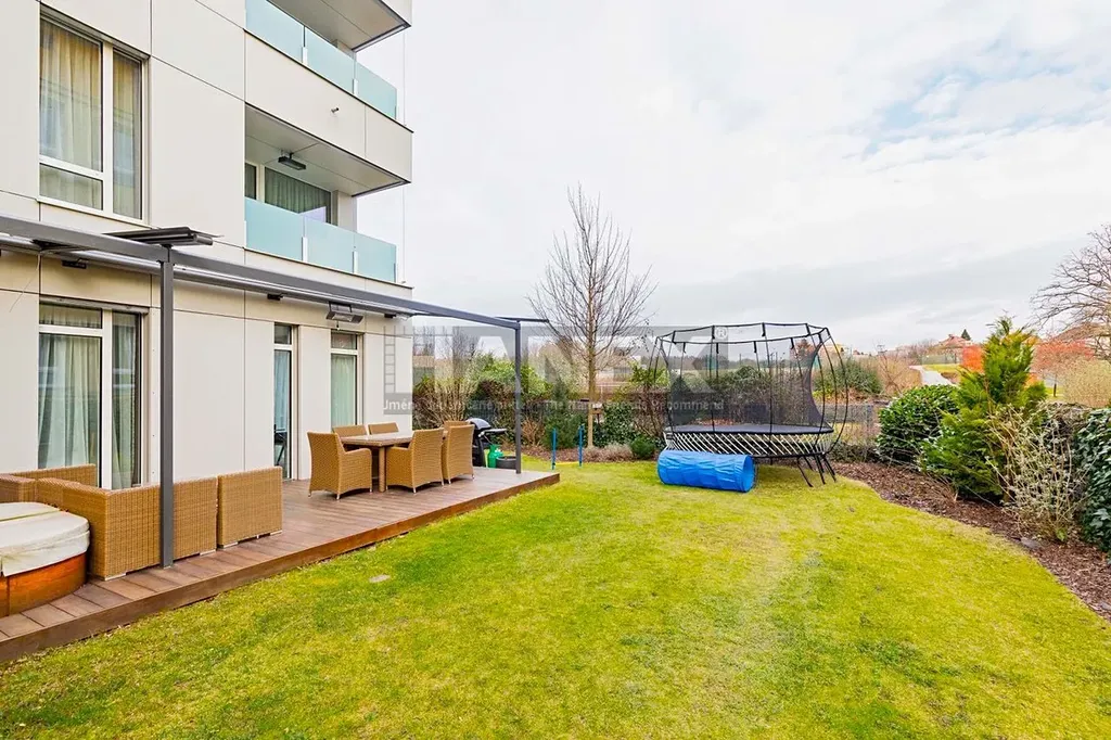 Moderní designový byt 3+kk (99 m2) s velkou privátní zahradou (200 m2), parkovacím stáním a sklepem v luxusní rezidenci v Praze 4 – Hodkovičkách. Nadstandardně vybavený a zařízený byt vás nadchne svou velkorysou dispozicí a vzdušností. Plně klimatizovaný byt nabízí 2 ložnice, prostornou šatnu – walk in closet, koupelnu s vanou, sprchový kout a toaletou a samostatnou toaletu. Z obývacího pokoje (40 m2) s kuchyňským koutem je přímý vstup do zahrady. Kuchyňská linka s ostrůvkem je vybavena kvalitními vestavěnými spotřebiči. Luxusní bydlení doplňuje krytá terasa s vířivkou. Předokenní žaluzie. Orientace bytu jih a východ.