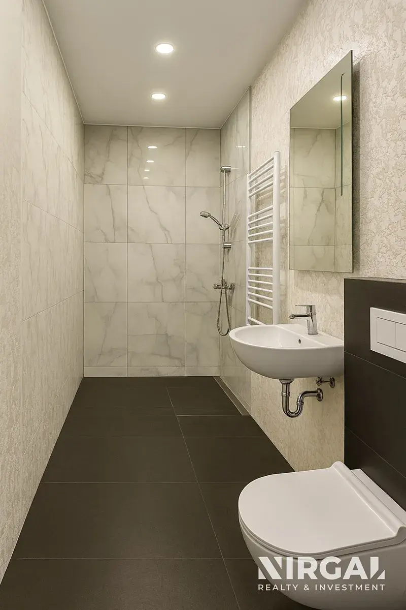 Interiér velmi prostorného obývacího pokoje, laděný ve světlých tónech, působí elegantně a vzdušně a nabízí harmonický prostor s dostatkem denního světla. Otevřená kuchyň je propojena s obývacím pokojem a ložnicí orientovanou do klidné ulice, což zajišťuje maximální soukromí. Oba pokoje jsou vybaveny elegantní parketovou podlahou, která interiéru dodává noblesní charakter. Byt je částečně vybavený – součástí je nová kuchyňská linka se spotřebiči (trouba, digestoř, varná deska, myčka, lednice). V koupelně se nachází sprchový kout, toaleta, podlahové vytápění a moderní žebříkový radiátor. Součástí vybavení je také pračka.