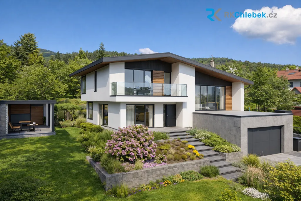 Prostorný obývací pokoj a kuchyně se spíží, tvořící přirozené centrum rodinného života. Z tohoto podlaží je rovněž vstup na střešní část garáže, která nabízí možnost vybudovat velkou terasu s výhledem do zeleně.