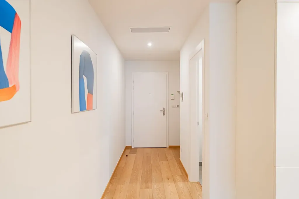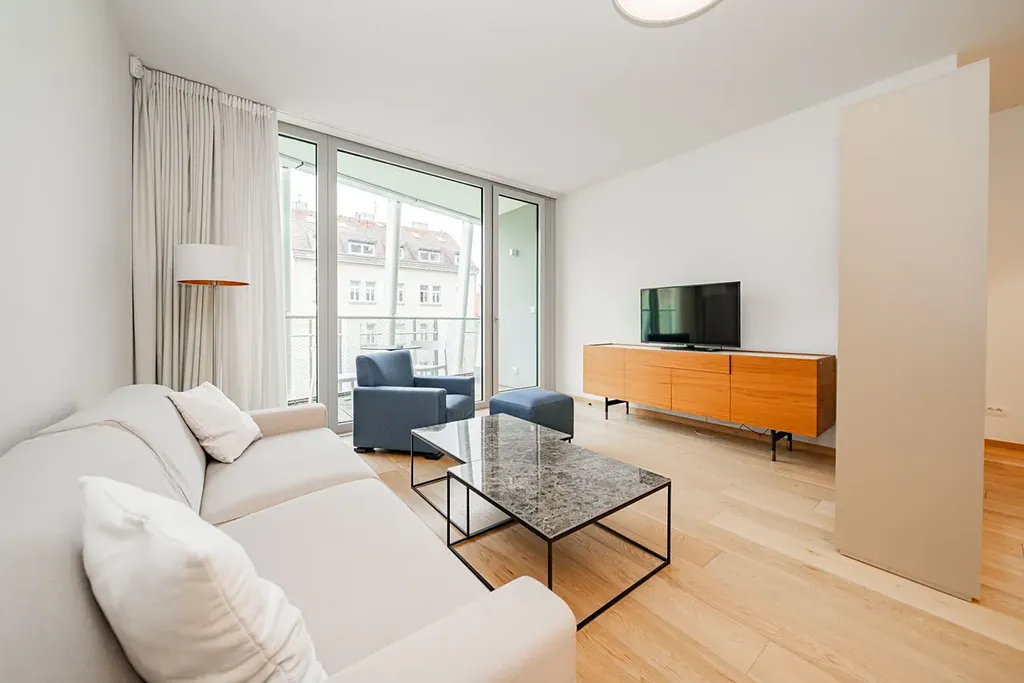 Stylový zařízený byt 2+kk (1 ložnice, 1 koupelna), s terasou (14,28m2) a celkovou plochou 87,92m2, je situován ve 3. patře luxusního rezidenčního komplexu s výtahem, recepcí, bazénem, ​​saunou, prostornou zahradou ve dvoře, sklepem a možností parkování v podzemním parkovišti.