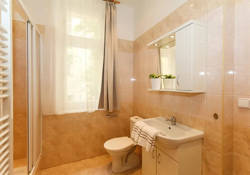 Tento světlý byt zahrnuje vstupní chodbu, prostorný obývací pokoj s jídelním koutem a kuchyňskou linkou plně vybavenou vestavěnými spotřebiči (elektrická varná deska, trouba, lednice, mikrovlnka), jednu samostatnou ložnice s okny směřujícími do klidného dvora, koupelnu se sprchovým koutem, umyvadlem, toaletou a pračkou. Mezi další příslušenství patří TV se satelitem, DVD, WiFi.