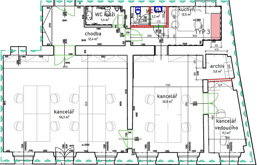 Prostory jsou nezařízené a dispozičně nabízí vstupní chodbu (12,4m2), tři samostatné kanceláře (11,1m2, 32m2 a 56,3m2), čajovou kuchyňku (12,5m2) vybavenou spotřebiči (varná deska, lednice, myčka), dvě samostatné toalety (3,4m2 a 3,2m2) a archiv (3m2). Prostory jsou orientovány na Václavské náměstí. Na chodbě, toaletách, v kuchyňce a archivu jsou vinylové podlahy, v kancelářích jsou koberce. Ve všech místnostech jsou rozvody sítí (zásuvky, internet, optický kabel).
