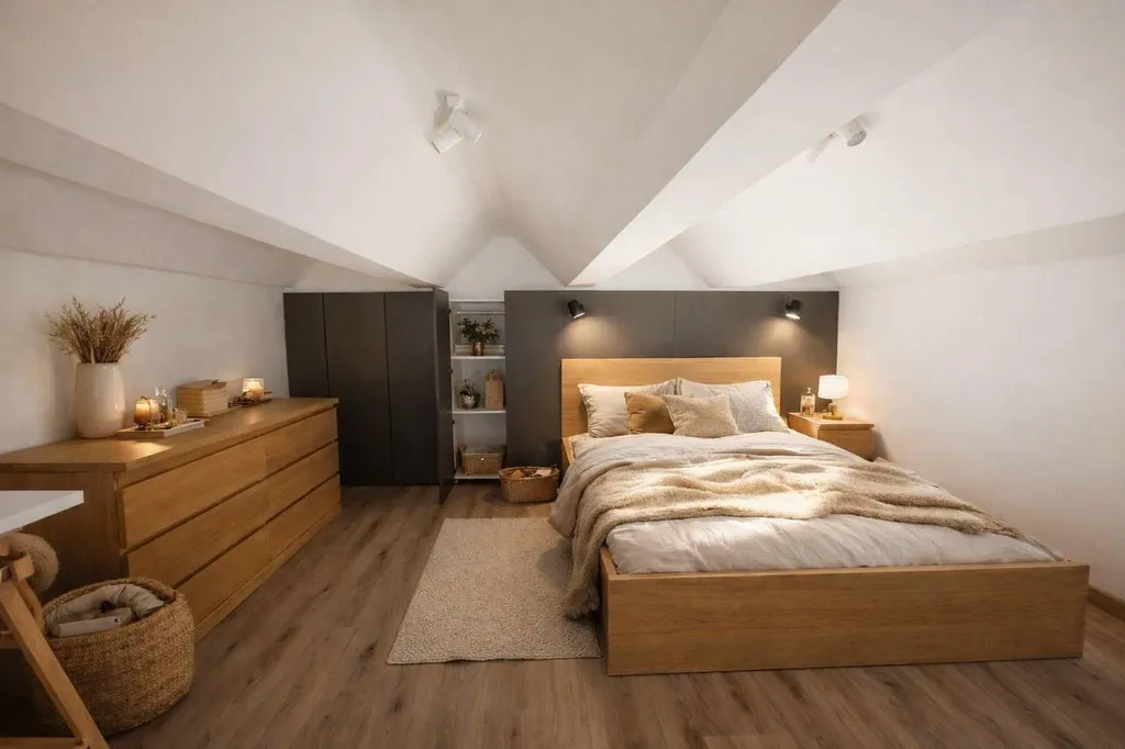 Z obývacího pokoje vedou stylové schody do ložnice se sníženým vlnitým stropem, která je vybavena kvalitní manželskou postelí (bez matrace), skříněmi na ukládání věcí a komodou. Koupelna je moderní, vybavená sprchovým koutem a novou pračkou. Veškerý nábytek a vybavení jsou součástí pronájmu byt je připraven k okamžitému nastěhování bez dalších investic.