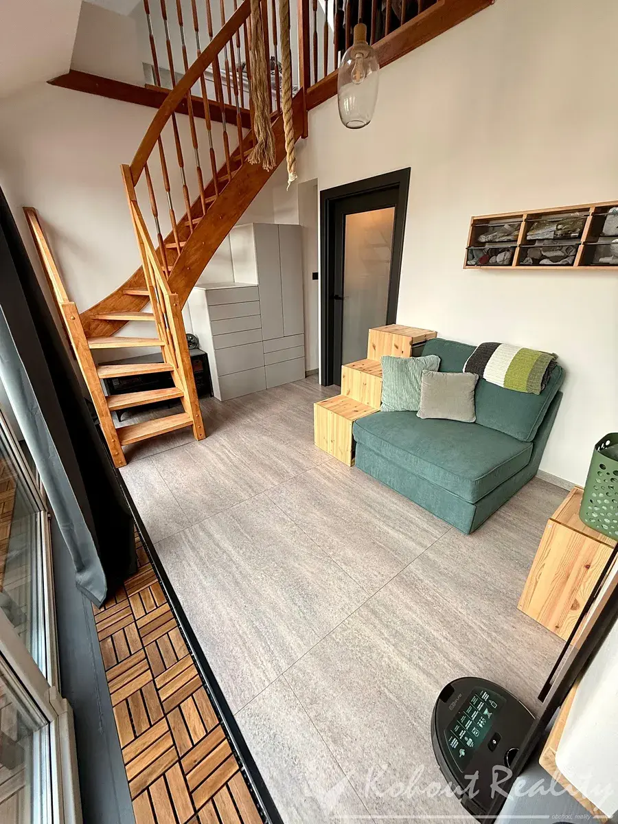 Byt je řešen jako mezonet. V přízemí se nachází prostorný obývací pokoj s masivní dubovou kuchyňskou linkou a lakovanou bukovou pracovní deskou, indukčním sporákem dále jídelní část, hala, samostatné WC a koupelna.Součástí přízemí je také otevřený pokoj s přímým vstupem na terasu, z něhož vede dřevěné schodiště do horního patra. Tento pokoj lze uzavřít posuvnou příčkou, dekoračním závěsem a využít ho například jako pracovnu, studovnu nebo rohový pokoj pro návštěvy (přiloženo více fotografií z různých úhlů pro Vaší představu). V 1. patře se nachází ložnice, koupelna s WC a velké množství úložných prostor. Byt má dvě koupelny, nové rozvody vody a odpadů, vodní podlahové topení, vinylové podlahy, klimatizaci s rekuperací a výměníkem.