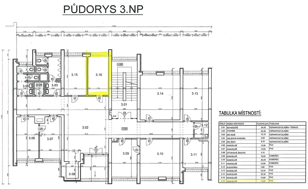 Kancelář č. 3.16 o výměře 13,6 m2 se nachází ve 3. nadzemním podlaží (NP).