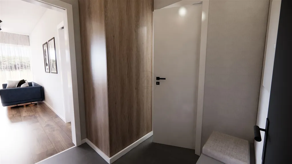 Dispoziční řešení apartmánu klade důraz na funkčnost, dostatek denního světla a plynulé propojení interiéru s exteriérem prostřednictvím prostorné terasy. Vstupní část tvoří zádveří, ze kterého se vstupuje do obytného prostoru s kuchyňskou částí a přímým výstupem na terasu. Na obytnou část navazuje ložnice a koupelna s WC. Orientace apartmánu je navržena s ohledem na maximální využití výhledů a klidného charakteru lokality.