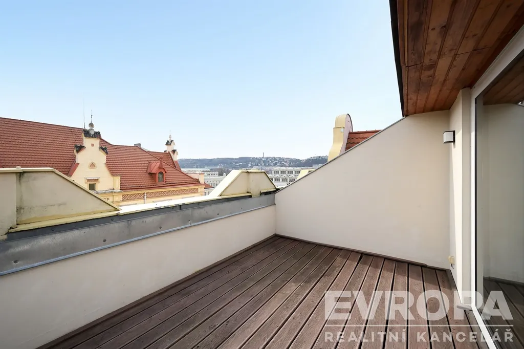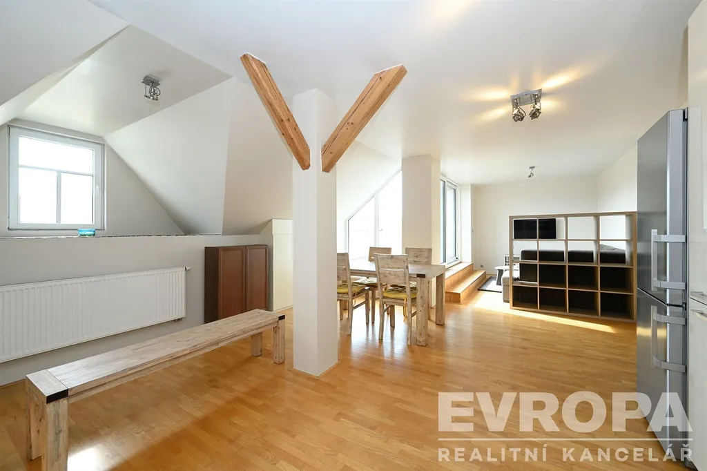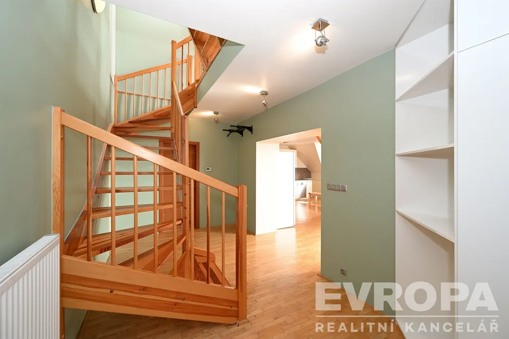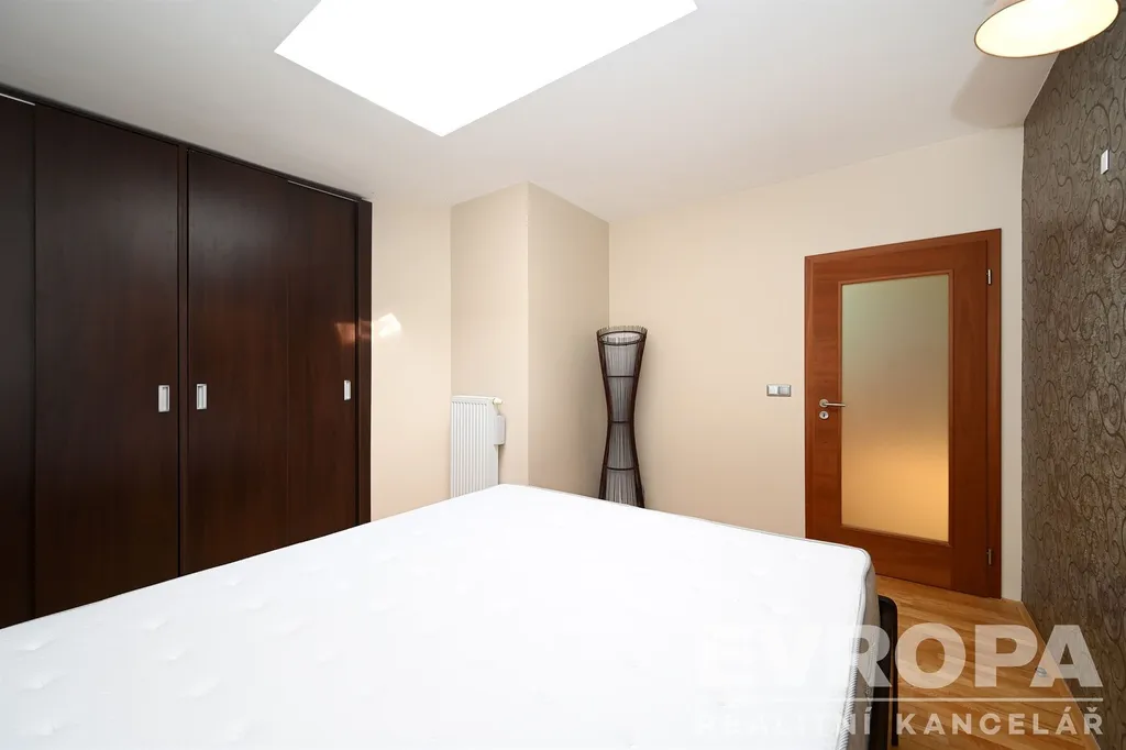 Nabízíme k pronájmu kompletně zařízený podkrovní mezonetový byt 2+kk o rozloze 105 m 2, situovaného v 56 N.P. v činžovním domě s výtahem v klidné ulici v Podolí se střešní terasou s výhledem na Prahu. Byt je prostorný, světlý, orientovaný na jižní stranu. Výhodná lokalita s plnou občanskou vybaveností v blízkém okolí, v pěším dosahu MHD s dobrou dostupností na stanice metra a nábřeží Vltavy. V těsné blízkosti bytu je památka Vyšehrad s parkem. Nedaleko je bazén a koupaliště Podolí a Žluté lázně. Podél Vltavy vede oblíbená cyklostezka. Byt má ve spodní úrovni halu, obývací pokoj se vstupem na terasu, plně vybavenou kuchyňskou linku, koupelnu s vanou a toaletou. V patře je hala s výstupem na střešní terasu s nádherným výhledem na Vyšehrad, ložnice, a plně vybavená koupelna se sprchovým koutem a toaletou. Byt se pronajímá kompletně zařízený, včetně nábytku a všech spotřebičů. Ve vnitrobloku domu je možnost parkování, které je v ceně nájmu. Měsíční částka pro platbu nájmu je 37.000,Kč a 7.000,Kč poplatky. K dispozici ihned. Kauce jeden měsíční nájem 37.000,Kč. Pro více informací kontaktujte realitního makléře. Neplatíte provizi RK.