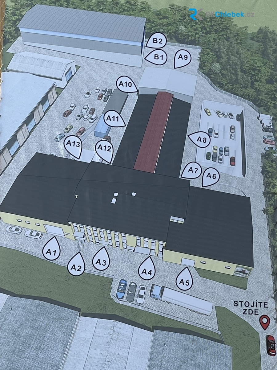 • Skladová / Výrobní hala se zázemím (vstup A9, A10 ) – 504 m² (cena 130 Kč/ m² měsíčně + 7681 Kč služby)