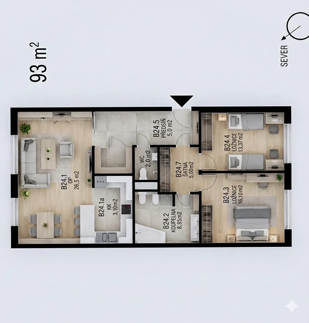 Byt se nachází v 5. patře s výtahem a nabízí dispozici 3+kk s užitnou plochou 93 m², což zajišťuje dostatek prostoru i pro rodinu nebo náročnější jednotlivce. Součástí bytu je sklep o velikosti 2 m², ideální pro uložení sezónních věcí. Celý byt je v osobním vlastnictví a díky modernímu provedení a pečlivému rozvržení místností působí velmi vzdušně a pohodlně.