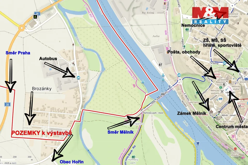 Nabízíme k prodeji rovinatý pozemek o výměře 992 m², určený pro výstavbu rodinného domu v klidné části obce Hořín–Brozánky, v bezprostřední blízkosti Mělníka. Pozemek je součástí komorního rezidenčního projektu s devíti moderními rodinnými domy, který klade důraz na soukromí, bezpečnost a klidné bydlení. Celý areál je navržen jako uzavřený komplex se soukromým vjezdem opatřeným automatickou bránou a kompletním oplocením. Pozemek je plně zasíťovaný – elektřina i ostatní inženýrské sítě jsou již vybudovány. Dokončení příjezdové komunikace a oplocení do konce dubna. Dle územního plánu je povolena výstavba rodinného domu o jedné bytové jednotce se zastavěností až 40 %. Lokalita nabízí ideální kombinaci klidného bydlení a výborné dostupnosti. Centrum Mělníka je vzdáleno pouhé 3 minuty jízdy, dálnice D8 přibližně 5 minut a do části Praha–Letňany se dostanete zhruba za 25 minut. Samozřejmostí je také vlakové a autobusové spojení v Mělníku. Atraktivní nabídka pro pohodlné rodinné bydlení.