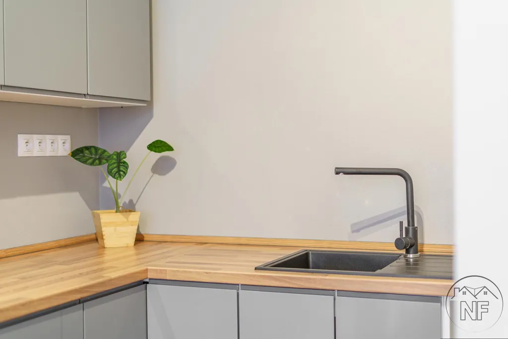 Hlavní obytný prostor nabízí chytré osvětlení, laminátovou plovoucí podlahu a plastová okna s elektricky ovládanými roletami. Moderní kuchyňská linka je vybavena vestavěnými spotřebiči včetně myčky. Součástí prodeje je i lednice.