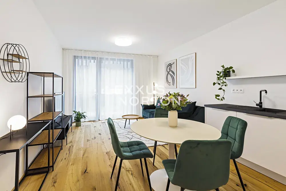 Tento nový zařízený byt o dispozici 2+kk nabízí k užívání vstupní chodbu, prostorný obývací pokoj s plně vybaveným kuchyňským koutem, ložnici s vestavěnou skříní, koupelnu a samostatnou toaletu. Z ložnice je vstup na terasu s výhledem do vnitrobloku. K bytu náleží sklep a garážové parkovací stání s auto výtahem za poplatek. Ve vnitrobloku je k dispozici společný prostor na mytí kol a posezení.