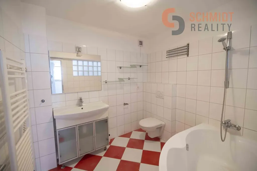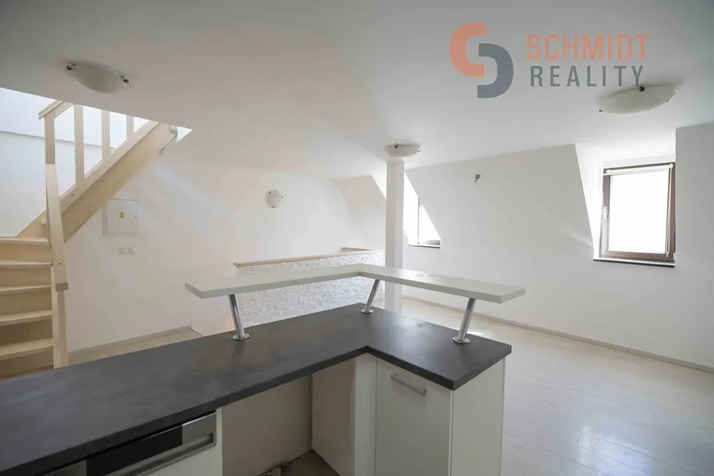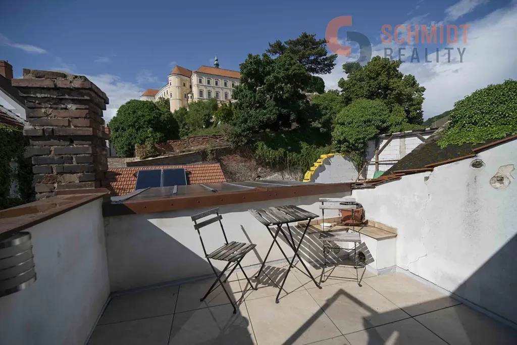 Nabízíme pronájem mezonetového bytu 2+kk v centru Mikulova. Celková výměra vč. terasy činí 86 m2.  Jedná se o menší byt s mezonetem situovaný v patře rodinného domu. Patro je složeno z obývacího pokoje s kuchyňským koutem, jedné ložnice a koupelny s WC. V dalším patře je situován mezonetový prostor, který je možné využít jako další ložnici a dále terasa s výhledem na zámek. Ve spodním patře je el. podlahové vytápění. Mezonet je výtápěn el. přímotopem. Ohřev vody zajišťuje el. bojler. Měsíční náklady na energie činí cca 5.000 Kč/měs., v závislosti na režimu domácnosti. Vratná kauce 30.000 Kč. Parkování možné na ulici před domem s vyznačením pro rezidenty. Roční parkovací poplatek městu činí 600 Kč. Byt není vzhledem ke své členitosti vhodný pro nájemníky s malými dětmi. Více informací u makléře. Exklusivně nabízí Schmidt Reality Mikulov.