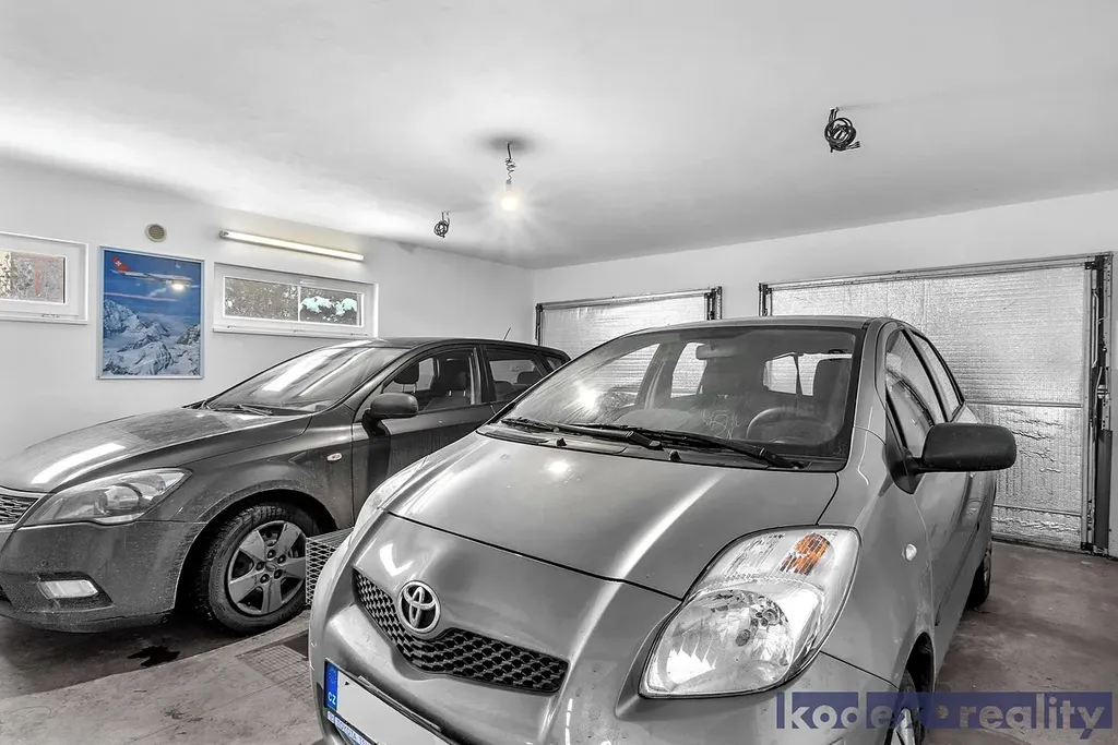 Přízemí - zádveří, WC, hala s botníkem a schodištěm do 1.patra, obývací pokoj s jídelnou a kuchyňským kouterm, ložnice, komora, koupelna s vanou i sprchovým koutem, WC a bidetem, spojovací úložná místnost do garáže pro dva automobily, jejíž součástí je také technická místnost a dílna se vstupem na zahradu.