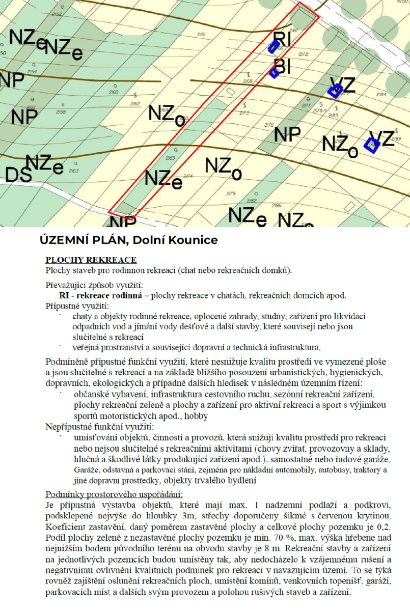 • Dle územního plánu (plocha RI) je zde přípustná výstavba objektu pro rodinnou rekreaci s jedním nadzemním podlažím a podkrovím. Ať už se tedy rozhodnete pro zvelebení současné stavby či vlastní chatu, jste na správném místě.
