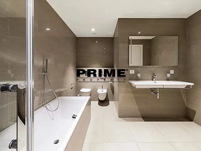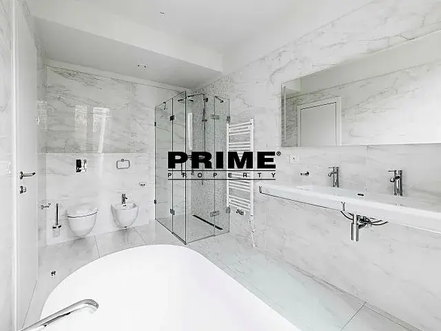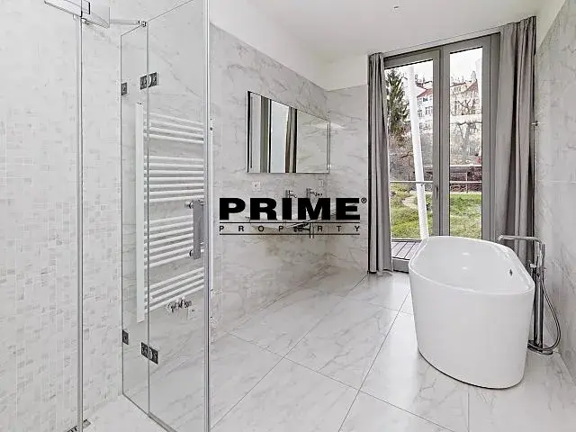 Moderní, exkluzivní, klimatizovaný, 3 ložnicový, nezařízený mezonetový byt k pronájmu, 4+kk, 212m2, se 3 koupelnami, se saunou, 3 terasami (celkem 80m2), zahrádkou (31m2) a s možností garážového stání (za poplatek), situovaný v 5. patře s výtahem v nově postaveném bytovém komplexu s recepcí, wellness klubem (vnitřní bazén, sauna, terasa s lehátky), společnou zahradou a podzemním parkingem.