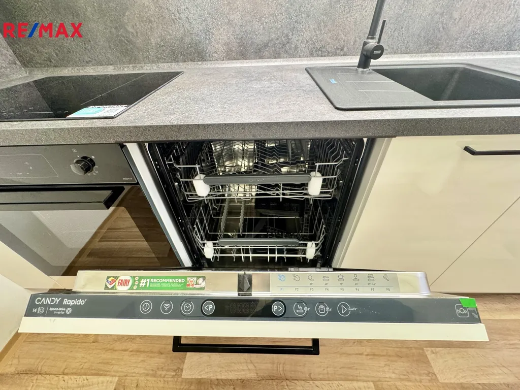 Kuchyně je plně vybavena moderními vestavěnými spotřebiči, lednicí s mrazákem, myčkou, troubou a indukční varnou deskou, což zajišťuje komfortní a funkční zázemí pro každodenní vaření.