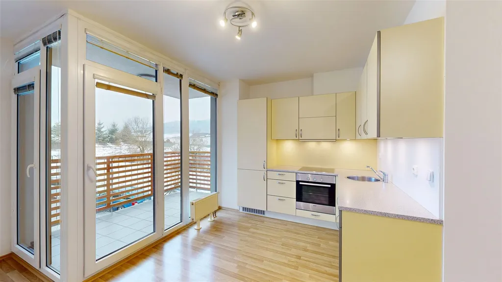 Dispozice bytu je praktická a nabízí komfortní bydlení. Součástí je kuchyňská linka se spotřebiči – vestavěná lednice s mrazákem, elektrická varná deska, vestavěná trouba a myčka nádobí. K vybavení dále patří pračka a sušička. V ložnici i v předsíni jsou vestavěné skříně, které zajišťují dostatek úložného prostoru.